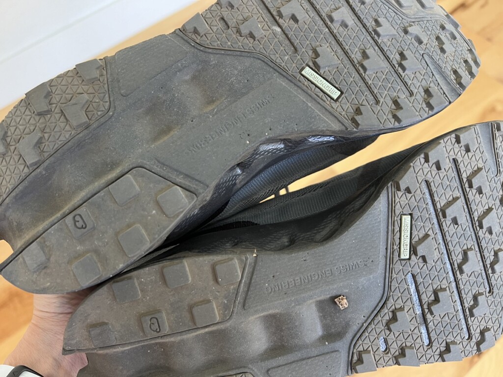 The other thing I do have some questions about is the lifespan of these shoes. There are portions of the sole that are not covered in rubber, which is where you can see I have a burr stuck in to the shoe. So not a rock between pods, but now anything pointy is taking a spot in that exposed cushion.